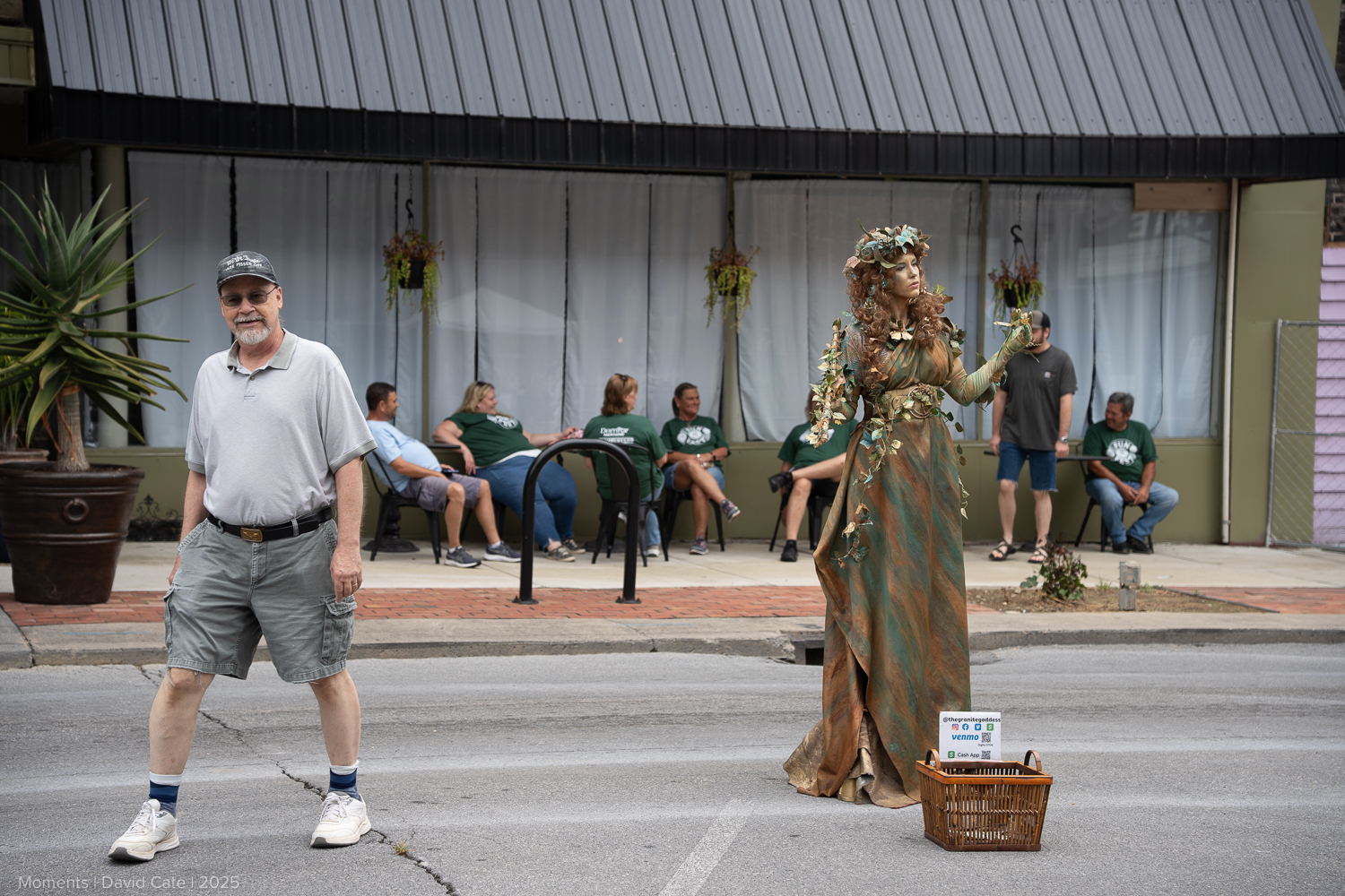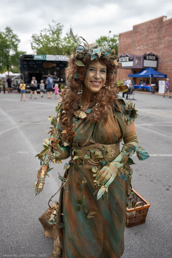 The first of the day’s troupe shimmered into view—Erin, the Granite Goddess, gilded in gold, preparing for her stony silence, while Mike balanced high on stilts like a gentle giant. Both had come from Asheville but blended into Broad Street as if they’d been here all along.
