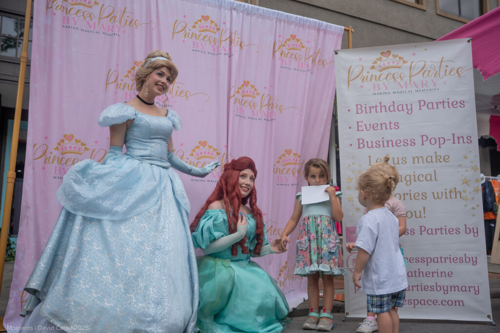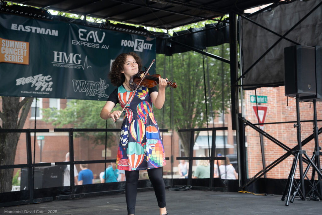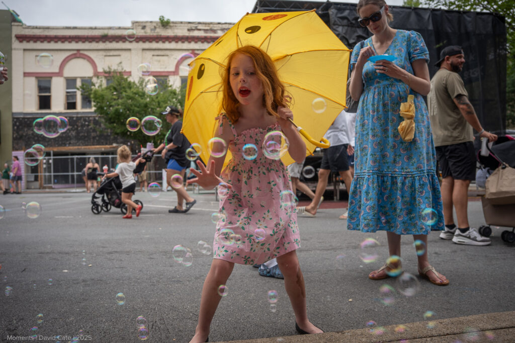 Not long after, the stage filled with music. A young fiddler named Chloe on Strings stepped up, her dad beside the stage, playing her background music with quiet pride. Chloe’s energy was contagious—bow flying across strings as she wove pop tunes into traditional fiddle runs. Later, she stepped down from the stage and carried her music into the street. Children gathered around her, dancing in loose circles, their laughter rising above the hum of the fair. It was one of those rare moments where you could feel music tying people together right there on the pavement.