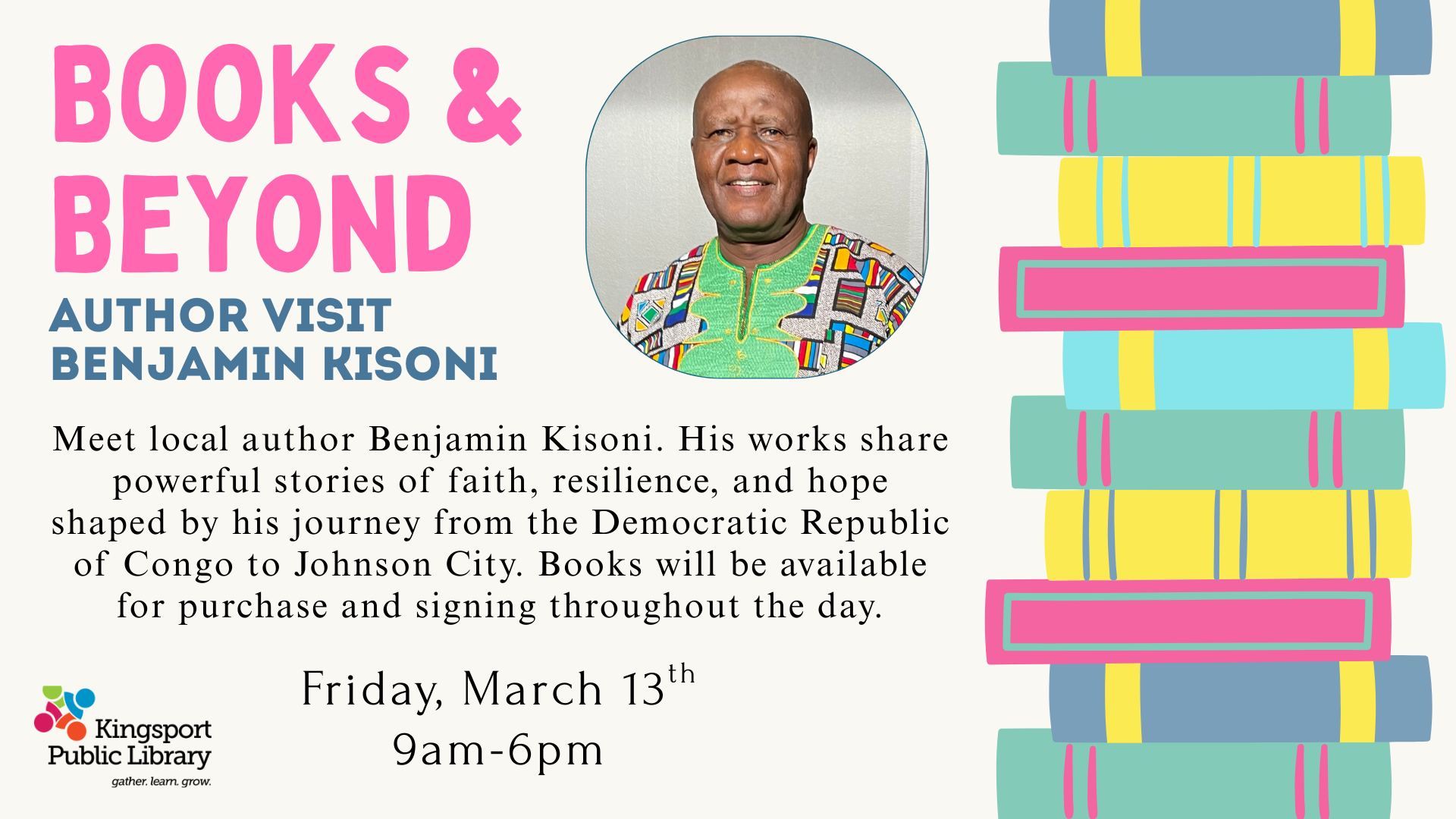 Meet local author Benjamin Kisoni. His works share powerful stories of faith, resilience, and hope shaped by his journey from the Democratic Republic of Congo to Johnson City. Books will be available for purchase and signing throughout the day.