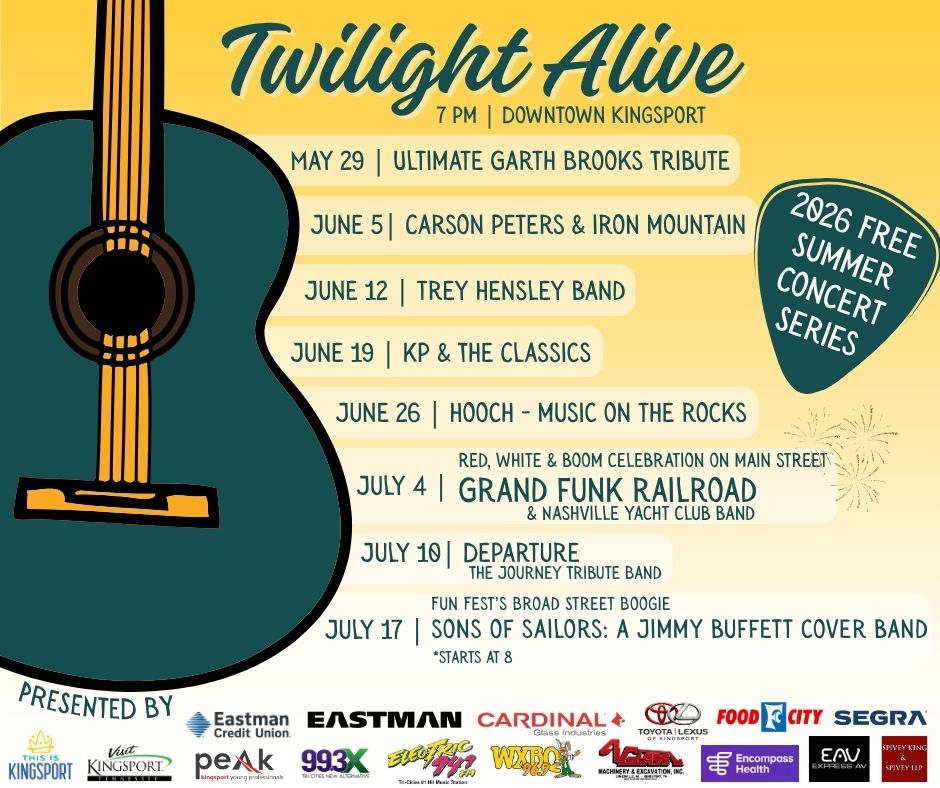 Sponsors for this year’s Twilight Alive Summer Concert Series includes Cardinal Glass Industries, Eastman, This is Kingsport, Visit Kingsport, Eastman Credit Union, Toyota of Kingsport, Lexus of Kingsport, Food City, Encompass Health Rehabilitation Hospitals, Segra, Glass Machinery & Excavation, Inc., Spivey, King & Spivey, LLP, Peak – Kingsport Young Professionals, Express AV, Electric 94.9, 99.3 The X and 96.9 WXBQ.
